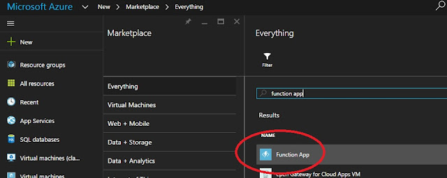 To create a new Azure Function App select New in the Azure Portal, search for "function app" and select the matching item.