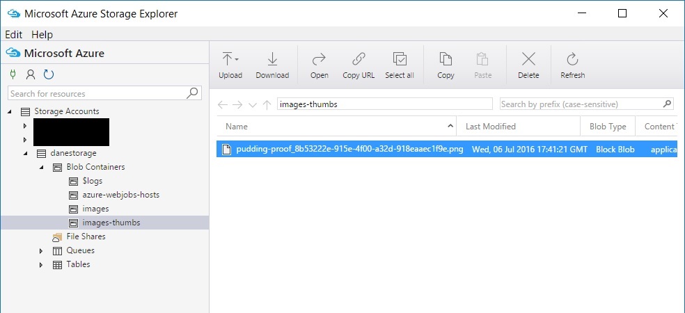 The "Submit" button made an HTTP request to the UploadImage Function triggering it and that image was archived to the Azure Storage BLOB container specified during the Function creation. The act of writing to the BLOB container triggered the MakeThumbnail Function which created a thumbnail of the original and stored it in the same container under a different path. The result is shown below using the Azure Storage Explorer.