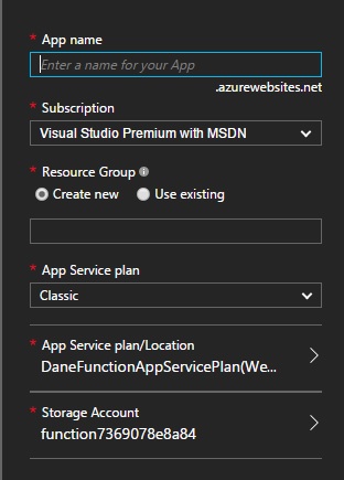 The Portal Blade used for initial creation of the Function App will be familiar to you if you've ever created an App Service app.