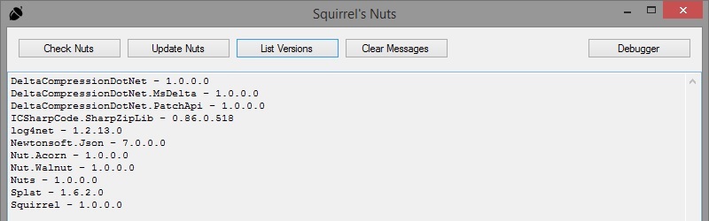The List Versions button displays basic information about the assemblies found in the current run-time environment, Clear Messages is self evident and Debugger calls System.Diagnostics.Debugger.Launch(). The Check Nuts and Update Nuts buttons both instantiate a new instance of Squirrel.UpdateManager. Check Nuts stops after checking for updates while Update Nuts continues to apply available updates.