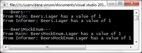 Next, I've added code to the Main method of the static Program class in the ConsoleApplication project whose purpose is to simply output value information for the Lager entries in both the Beers enum and the BeersMockEnum. This information is being retrieved in two ways. First, I access the types directly from the ConsoleApplication. Second, I access the types using the Informer class in the ClassLibrary project. The code to generate the output is as follows.